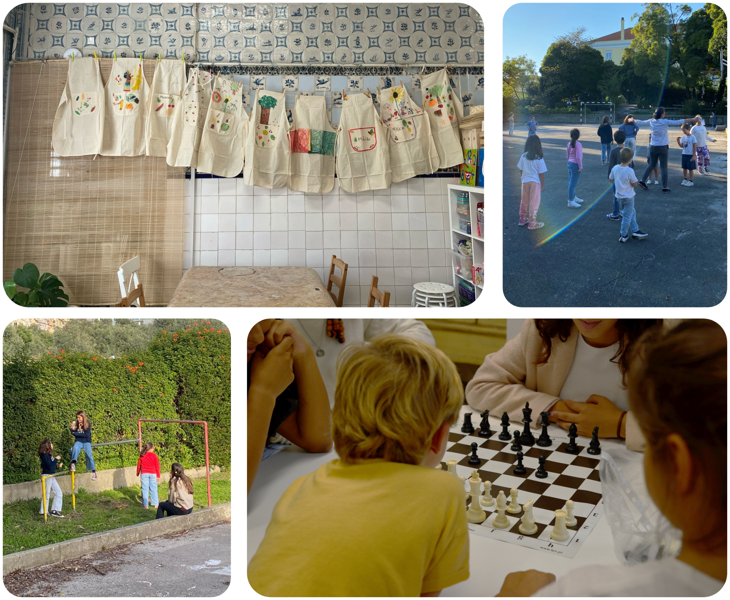 Todas as tardes há atividades em grupo, segmentadas por idades, com o objetivo de promover o encontro com o outro e o desenvolvimento de competências pessoais em diferentes áreas.